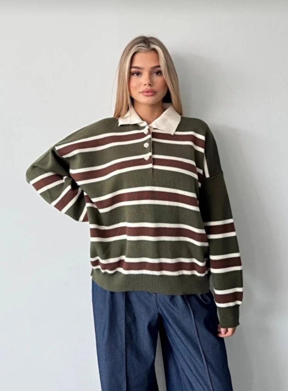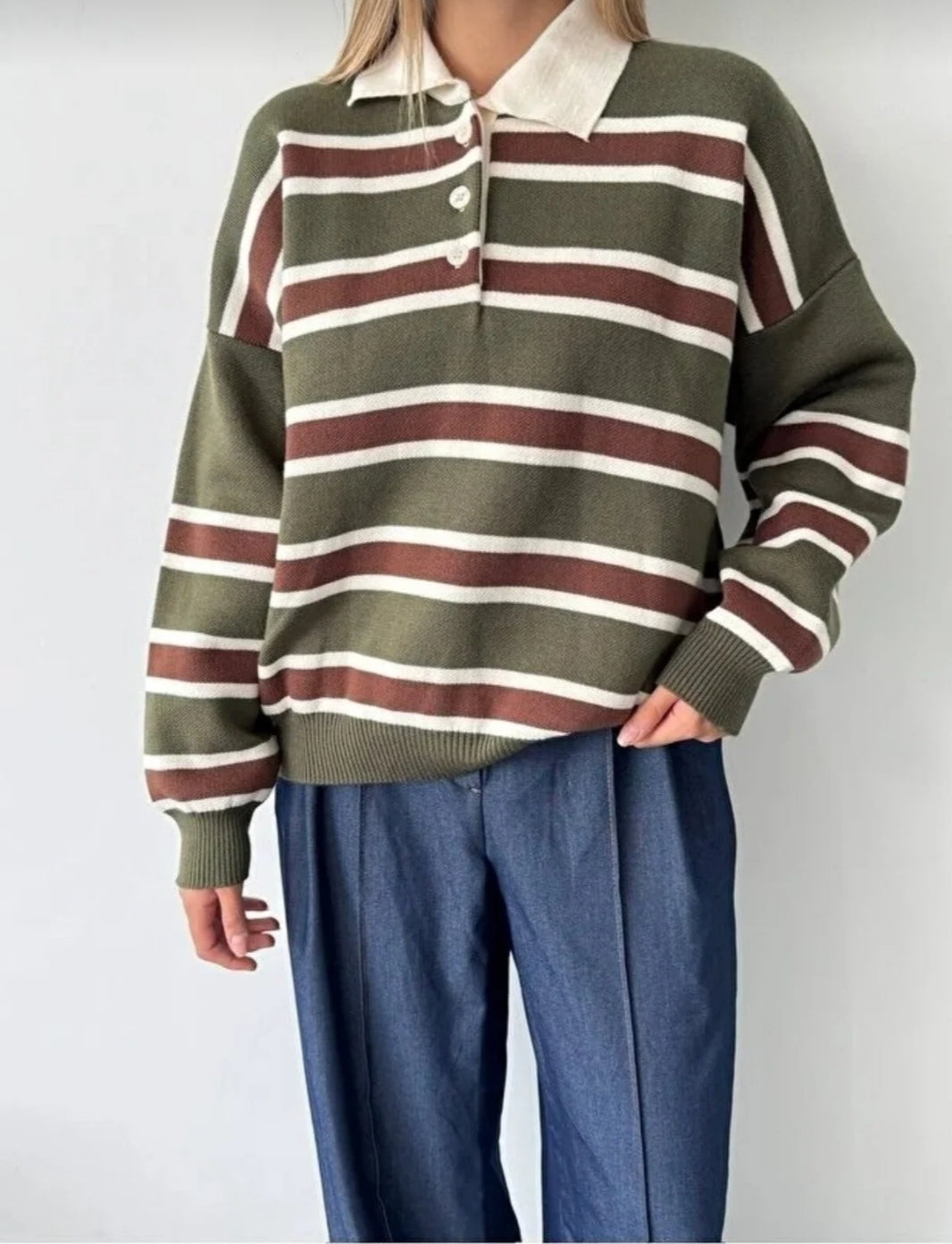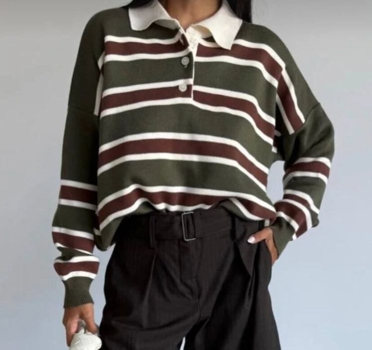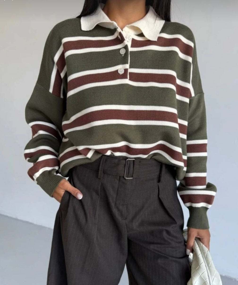 Çizgili Düğmeli Polo Yaka Premium Kadın Triko Kazak