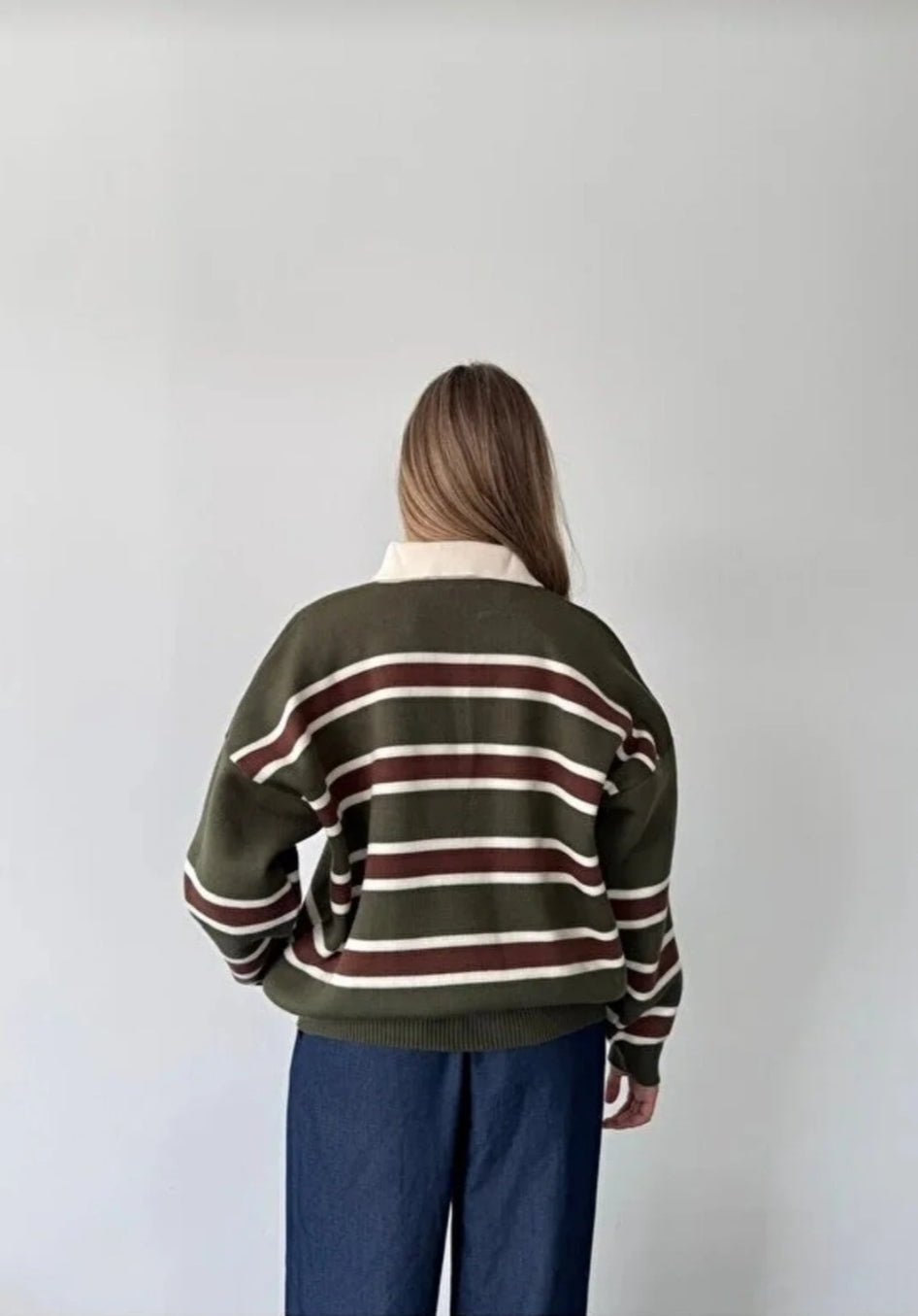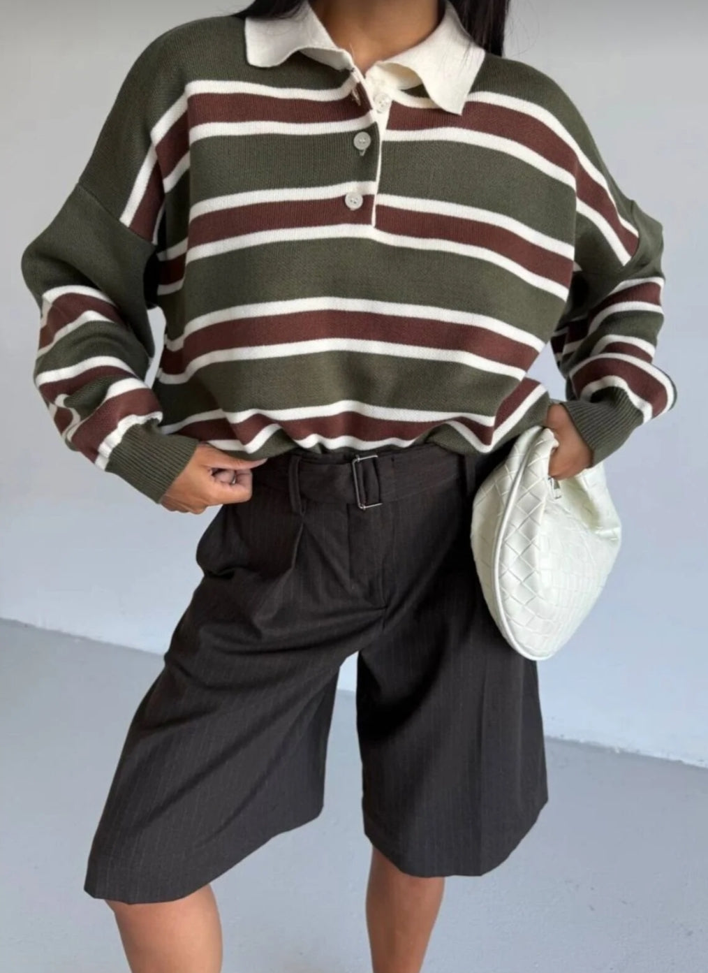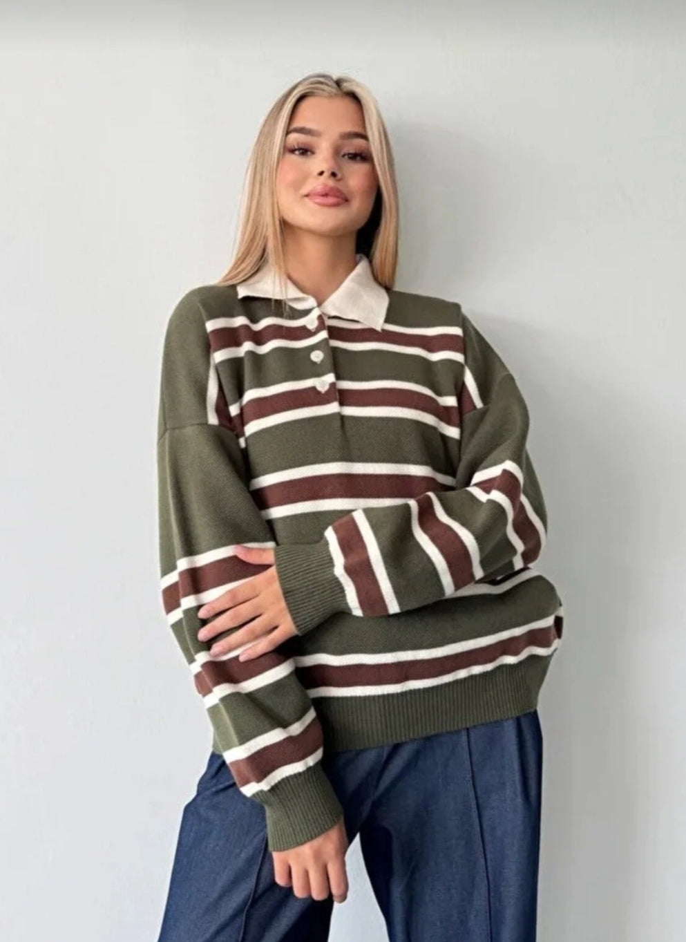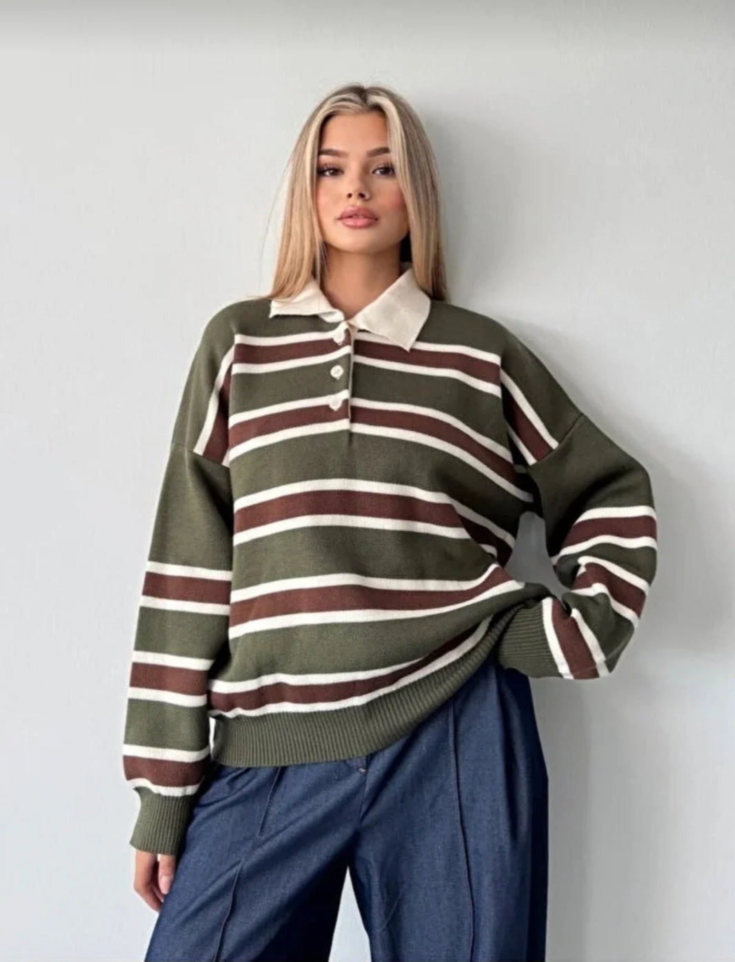 Çizgili Düğmeli Polo Yaka Premium Kadın Triko Kazak